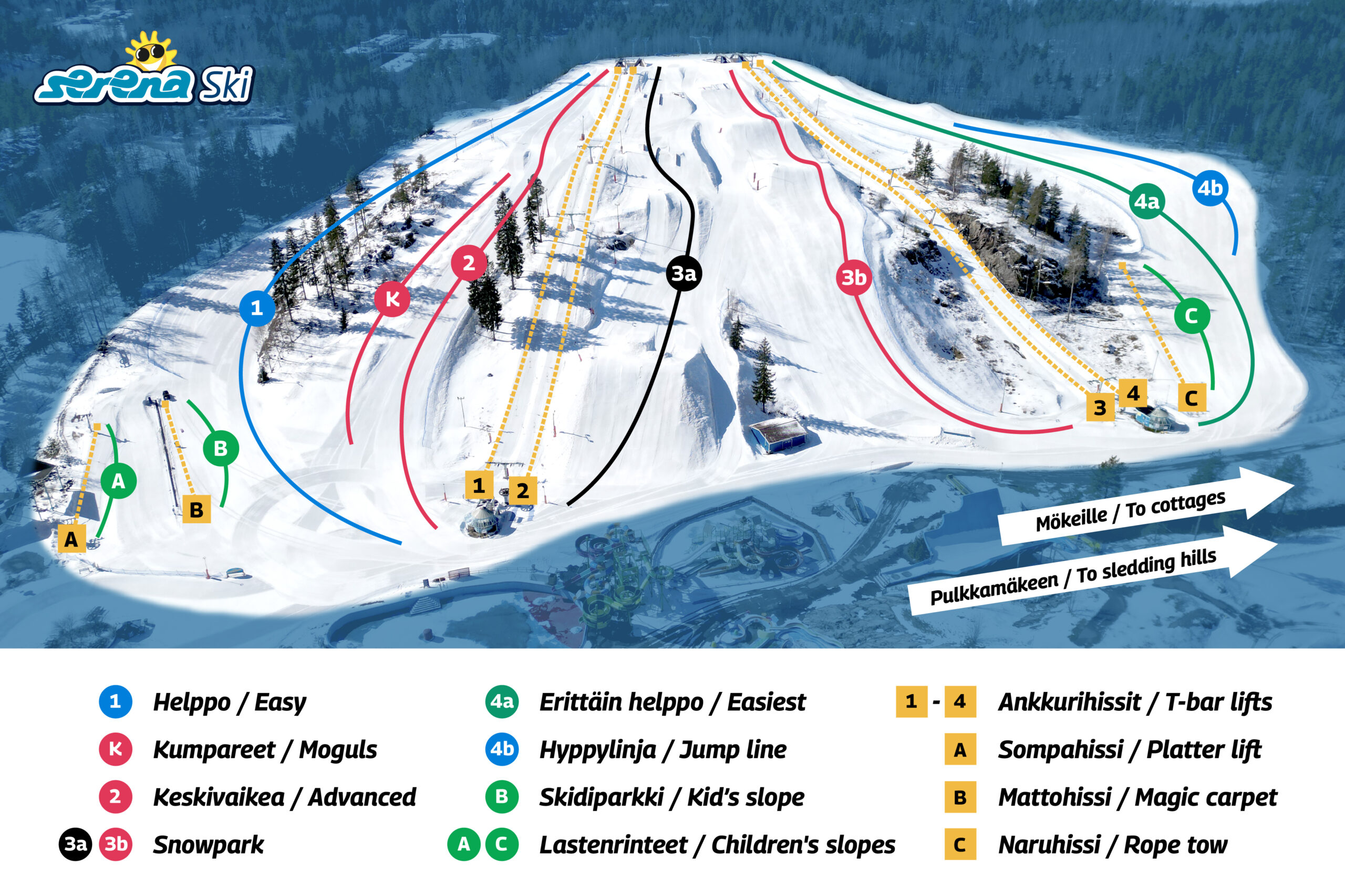 Espoon Hiihtokeskus Serenan Skistä löydät Etelä-Suomen siisteimmät rinteet! Rinteet sopivat kaikille taaperosta vaariin ja taitajasta aloittelijaan. Street -rinteistämme löytyy sopivan tasoisia haasteita niin huipuille kuin myös aloitteleville temppulaskijoille. Laskettelukeskus tarjoaa myös hiihtokoulun kattavalla kurssivalikoimalla ja ammattitaitoisilla ohjaajilla. Tutustu kurssi- ja tuntivalikoimaan tästä. Laadukkaita vuokravälineitä on tarjolla moneen tarkoitukseen ja kaiken kokoisille.
